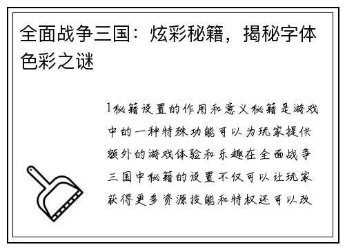 1. 秘籍设置的作用和意义 秘籍是游戏中的一种特殊功能,可以为玩家提供额外的游戏体验和乐趣。在全面战争三国中,秘籍的设置不仅可以让玩家获得更多资源、技能和特权,还可以改变游戏的难度和挑战程度。秘籍的设置不仅能够满足玩家的个性化需求,还能增加游戏的可玩性和娱乐性。 秘籍名字颜色的设置是秘籍系统中的一项...